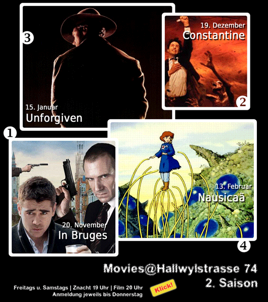 Constantine, Samstag 19. Dezember 2009 In Bruges, Freitag 20. November 2009 Unforgiven, Freitag 15. Januar 2010 Nausicaä aus dem Tal der Winde, Samstag 12. Februar 2010 Für einen Film anmelden: [klick!] Mail aux operateurs [clic!] Für einen Film anmelden: [klick!]